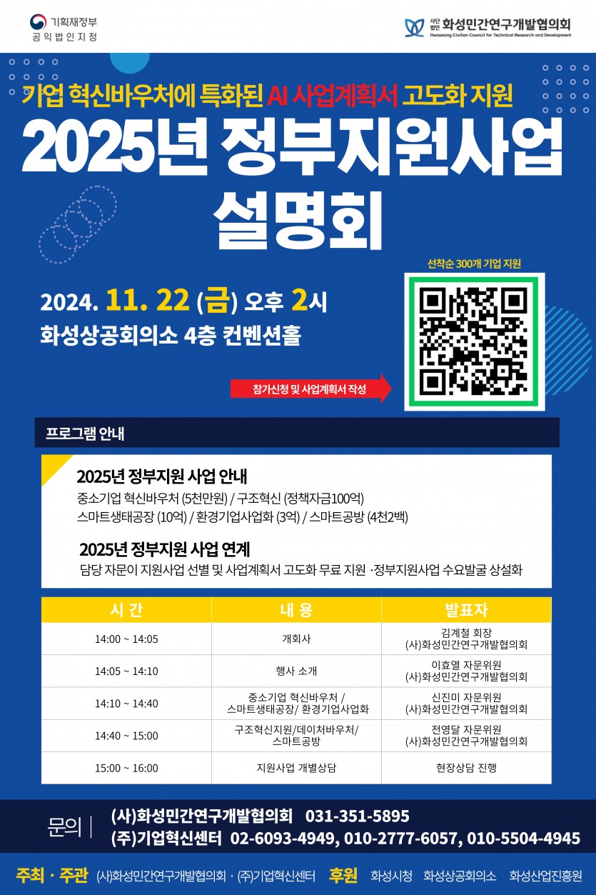 안녕하십니까. 화성민간연구개발협의회에서 '2025년 정부지원사업 설명회'를 개최합니다.