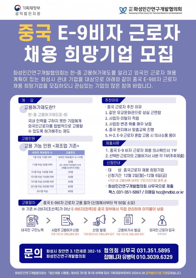 아래와 같이 중국 E-9비자 근로자 채용 희망기업을 모집하오니 관심있는 기업의 많은 참여 바랍니다. · 대 상 : 중국 근로자(E-9) 채용 희망기업 · 신청기간 : 12월 2일(월)~12월 6일(금) *기간 내 고용24에 내국인 구인기간(7일) 충족 必 · 제출서류 1. 중국 E-9 비자 근로자 채용 의사확인서 1부 [첨부파일] 2. 선택한 근로자의 고용허가서 사본 각 1부(추후제출) · 제출방법 화성민간연구개발협의회 사무국으로 제출 (팩스 031-351-5897 / 이메일 hcc@rndbiz.or.kr) · 문 의 처 협의회 사무국 031.351.5895 / 잡매니저 유병덕 010.3039.6329 감사합니다. |