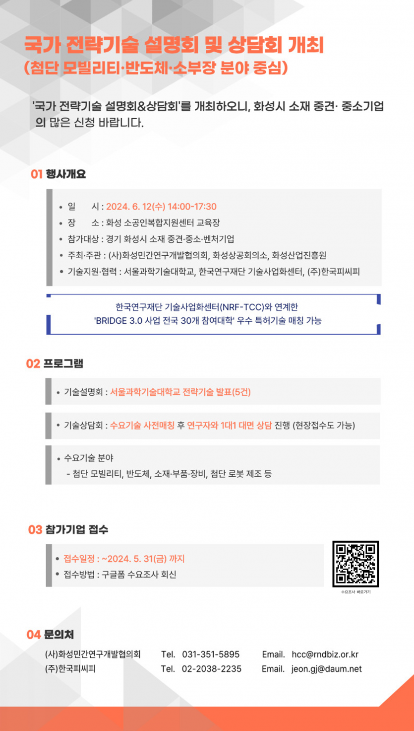 관내 중견·중소기업의 기술 경쟁력 강화를 통한 강소 첨단기업 육성 및 지역경제 활성화를 위하여 첨단 모빌리티·반도체·소부장 분야를 중심으로 '국가 전략기술 설명회 및 상담회'를 개최합니다. 참가를 원하시는 기업은 구글폼 수요조사(https://forms.gle/qzcTMub3vts4k6Zk6)에 참여해주시면 됩니다. <국가 전략기술 설명회 및 상담회> 1. 일 시 : 2024. 6. 12(수) 14:00~17:30 2. 장 소 : 화성 소공인복합지원센터 교육장 (경기도 화성시 봉담읍 매송고색로 462) 3. 참가대상 : 화성시 소재 중소/중견/벤처기업 4. 참가접수 : 5. 31(금)까지 구글폼 수요조사 회신 감사합니다. |