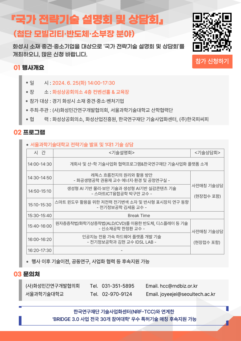 관내 중견·중소기업의 기술 경쟁력 강화를 통한 강소 첨단기업 육성 및 지역경제 활성화를 위하여 첨단 모빌리티·반도체·소부장 분야를 중심으로 '국가 전략기술 설명회 및 상담회'를 개최합니다. 참가를 원하시는 기업은 구글폼( https://forms.gle/zg86RwrrJQdrPdsY6 )을 통해 신청바랍니다. <국가 전략기술 설명회 및 상담회> 1. 일 시 : 2024. 6. 25(화) 14:00~17:30 2. 장 소 : 화성상공회의소 4층 컨벤션홀 및 교육장(EDU401) *경기도 화성시 향남읍 토성로 14 3. 참가대상 : 화성시 소재 중소/중견/벤처기업 4. 참가접수 : 6. 24(화)까지 구글폼 신청 ( https://forms.gle/zg86RwrrJQdrPdsY6 ) 감사합니다. |