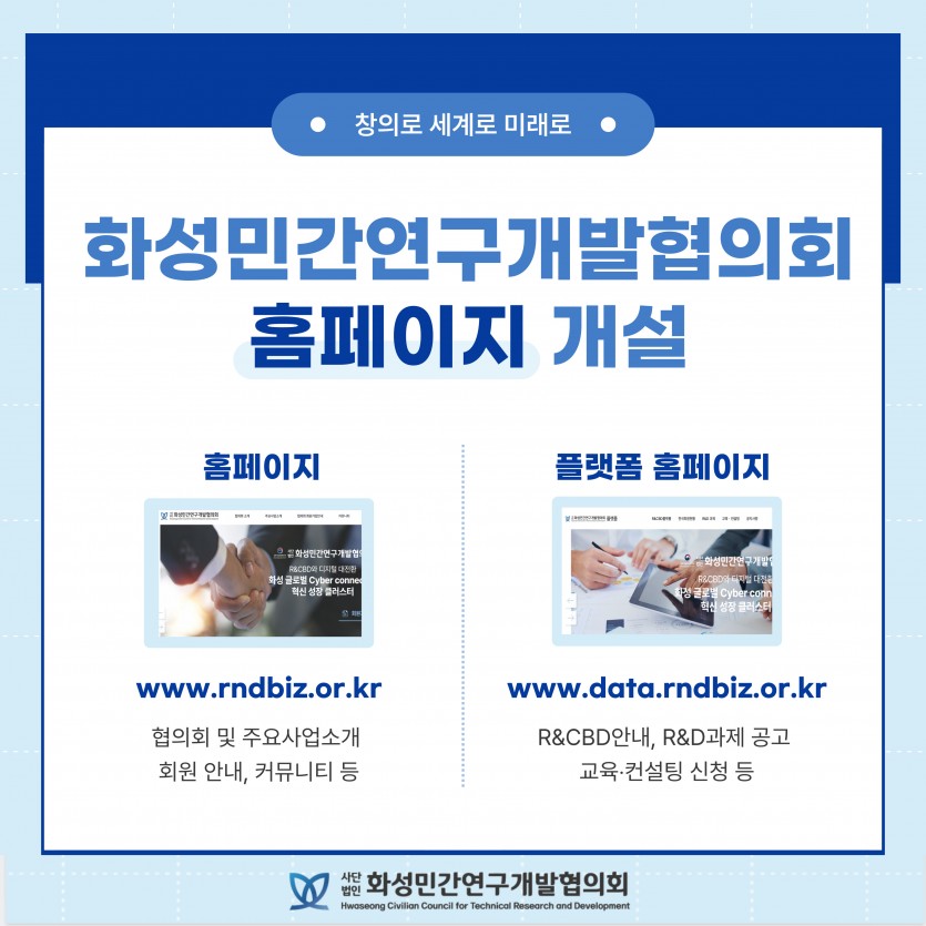 페이지 정보 작성자 최고관리자 조회 3,655 작성일 24-02-05 13:40 페이스북 공유 트위터 공유 목록 본문 제목 홈페이지 개설 안내 등록일 24-02-05 13:40 내용 본 회에서는 최신 R&D 과제 공고, 기업연구과제에 맞는 기관‧전문가 연계 등 회원기업에 도움을 드리고자 홈페이지를 개설하였습니다. 회원기업은 사업자번호로 로그인이 가능하오니 화성시 관내 중소‧ 중견기업의 소통의 장이 될 수 있도록 많은 참여 바랍니다. ☞ 플랫폼 홈페이지 이용 방법[과제업종 설정]은 아래의 링크(URL)를 통해 확인하시기 바랍니다. ※ 업종을 입력하시면 새로운 과제공고 시 키워드로 매칭 후 문자로 알려드립니다. 관련링크 http://data.rndbiz.or.kr/bbs/board.php?bo_table=notice&wr_id=15 2765회 연결 목록으로 이전글회원기업 가입비 및 회비 납부 안내 24.02.14 다음글협약그룹 한국기업.기술가치평가협회 업무협의 24.02.02